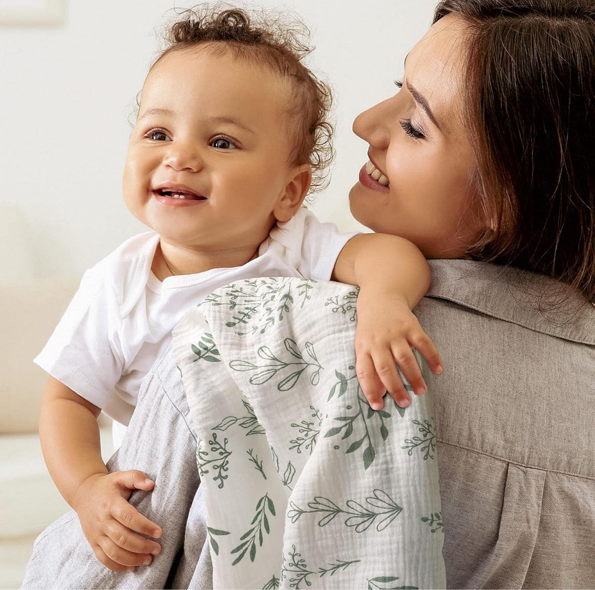 A muslin swaddle is lightweight, breathable, and versatile – use it as a swaddle, stroller shade, nursing cover, or a soft place to lay your baby down.